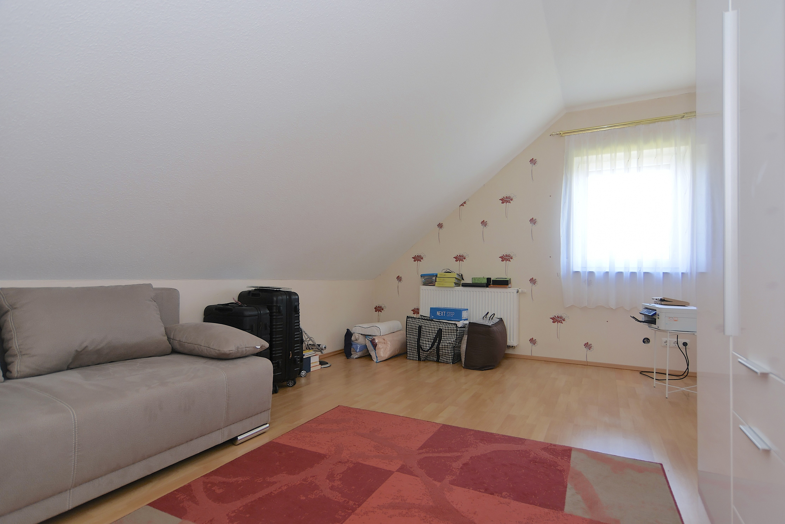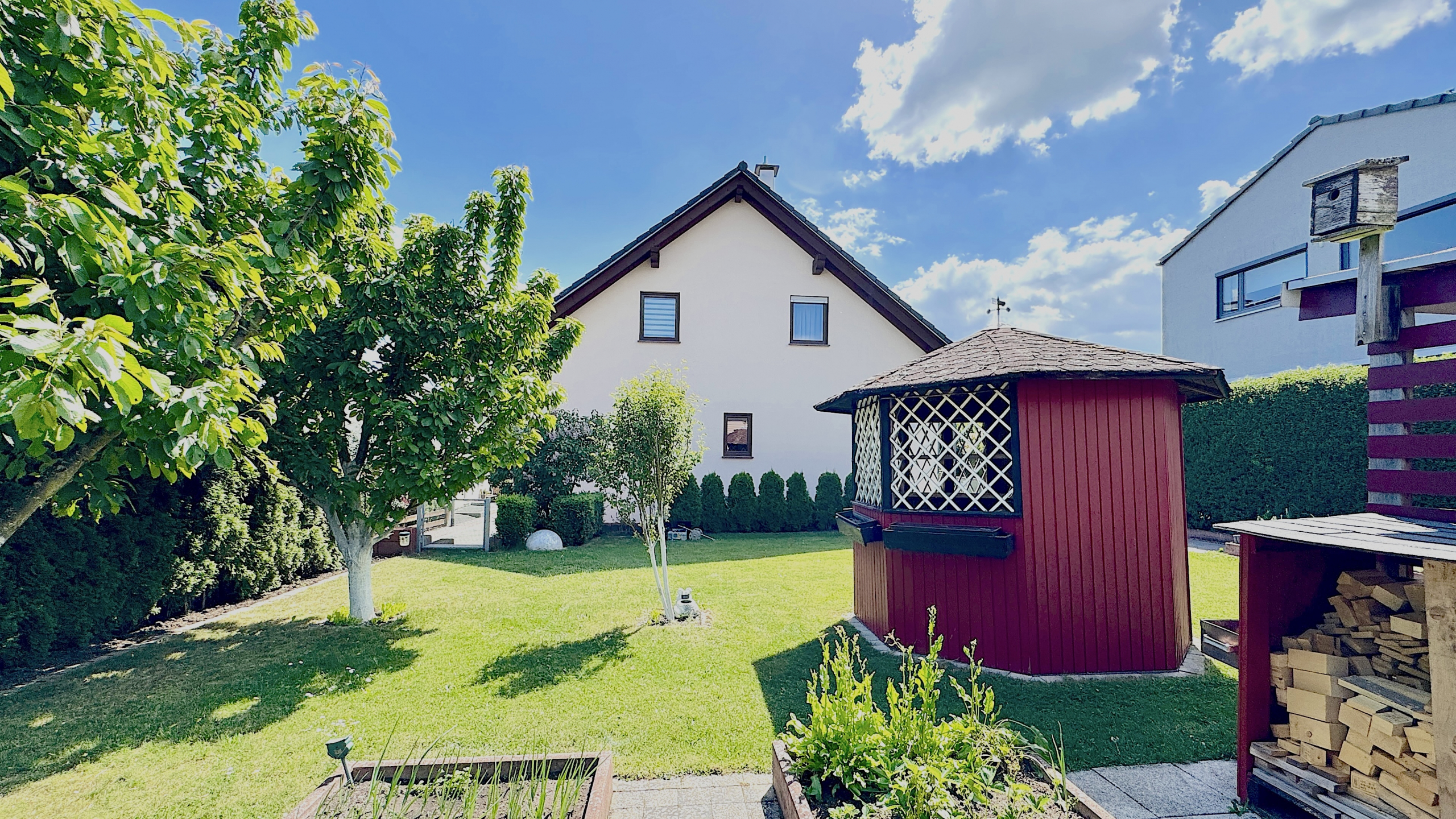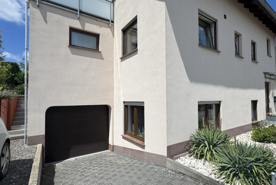 Mit einer Gesamtwohnfläche von ca. 206 m², aufgeteilt in Haupt- und Einliegerwohnung, bietet das Haus ausreichend Platz für bis zu zwei Haushalte. Die Hauptwohnung erstreckt sich über mehrere Ebenen und ermöglicht komfortables Wohnen auf einer Ebene - mit Wohnzimmer, Schlafzimmer, Küche mit Hauswirtschaftsraum (inkl. Waschmaschine und Trockner), direktem Zugang zur Terrasse und zusätzlichem Zimmer. Im ausgebauten Dachgeschoss befindet sich ein großer Balkon, der vielseitig nutzbar ist.
