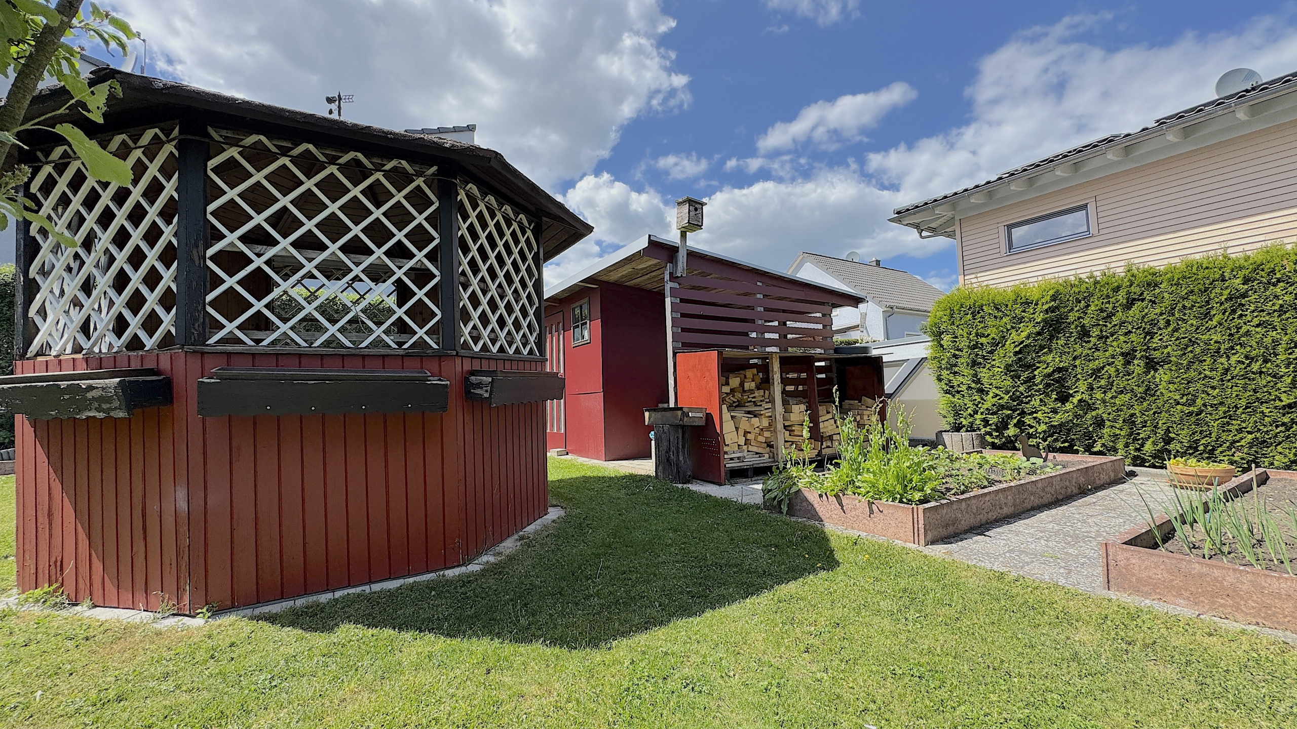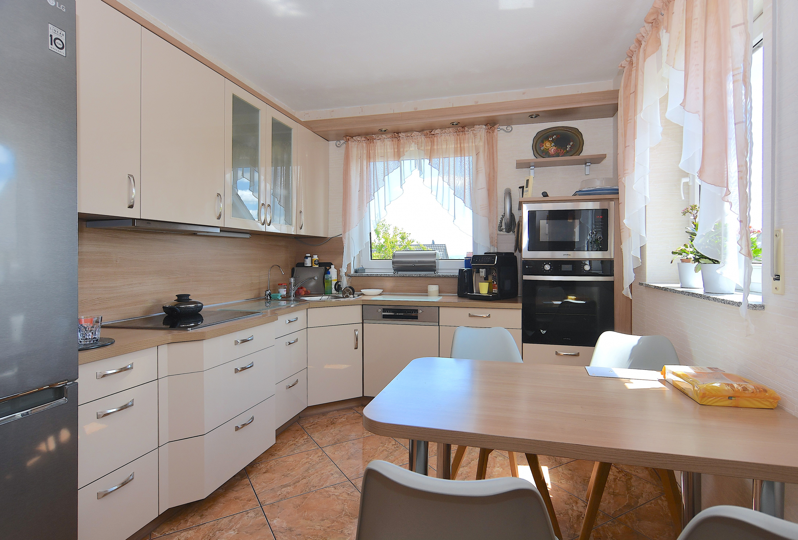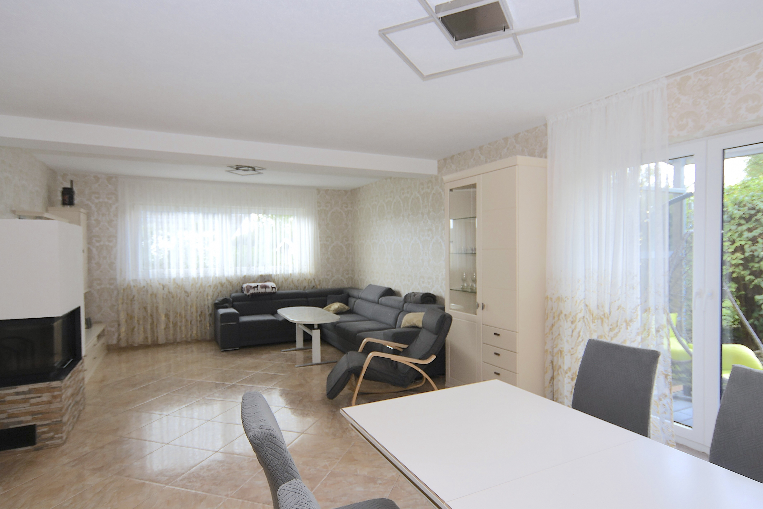 Mit einer Gesamtwohnfläche von ca. 206 m², aufgeteilt in Haupt- und Einliegerwohnung, bietet das Haus ausreichend Platz für bis zu zwei Haushalte. Die Hauptwohnung erstreckt sich über mehrere Ebenen und ermöglicht komfortables Wohnen auf einer Ebene - mit Wohnzimmer, Schlafzimmer, Küche mit Hauswirtschaftsraum (inkl. Waschmaschine und Trockner), direktem Zugang zur Terrasse und zusätzlichem Zimmer. Im ausgebauten Dachgeschoss befindet sich ein großer Balkon, der vielseitig nutzbar ist.